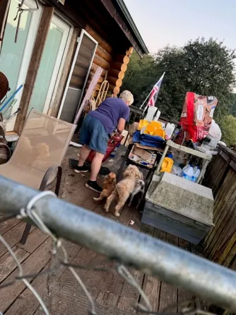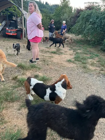 “When we arrived, we noticed a cream poodle tied to a pole to the left while approx. 20 other adult dogs ran around us and the car and the property. While we were still in the car, I saw poodles, golden retrievers, basset hounds, golden doodles and a boston terrier running up to the car. The moment that we got out of the car, I noticed fleas jumping all over us (I was wearing open toed shoes) from the ground and the dogs that were greeting us…..She took us to the puppies on her back deck that had poop all over and broken chicken wire.