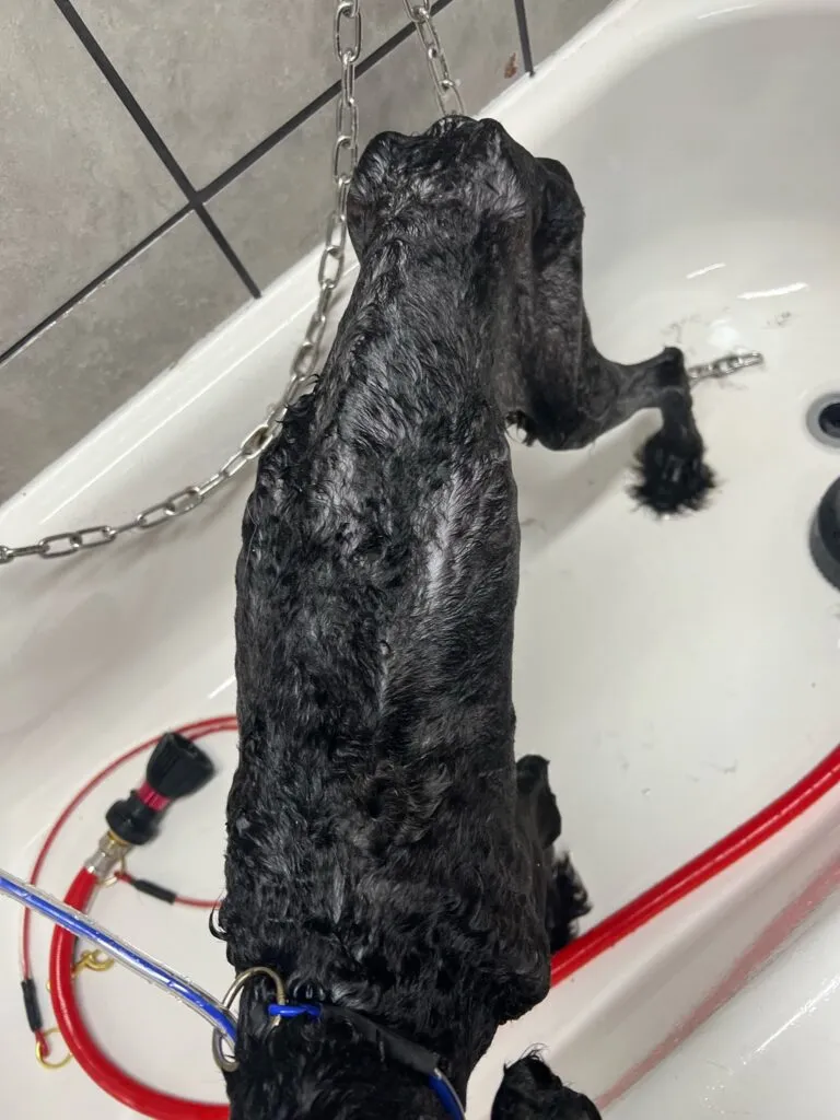 “When he arrived, his new owner mentioned that he did not move at all and I noticed his nose and up his snout was all black which was odd for a golden colored dog. As soon as I got him into the tub and starting running the water on him, the black on his snout started to move around I quickly realized he was infested with fleas. As I ran the water more along his back and body, the water that was running off was bloody and I could see hundreds and hundreds of fleas crawling all over him.”