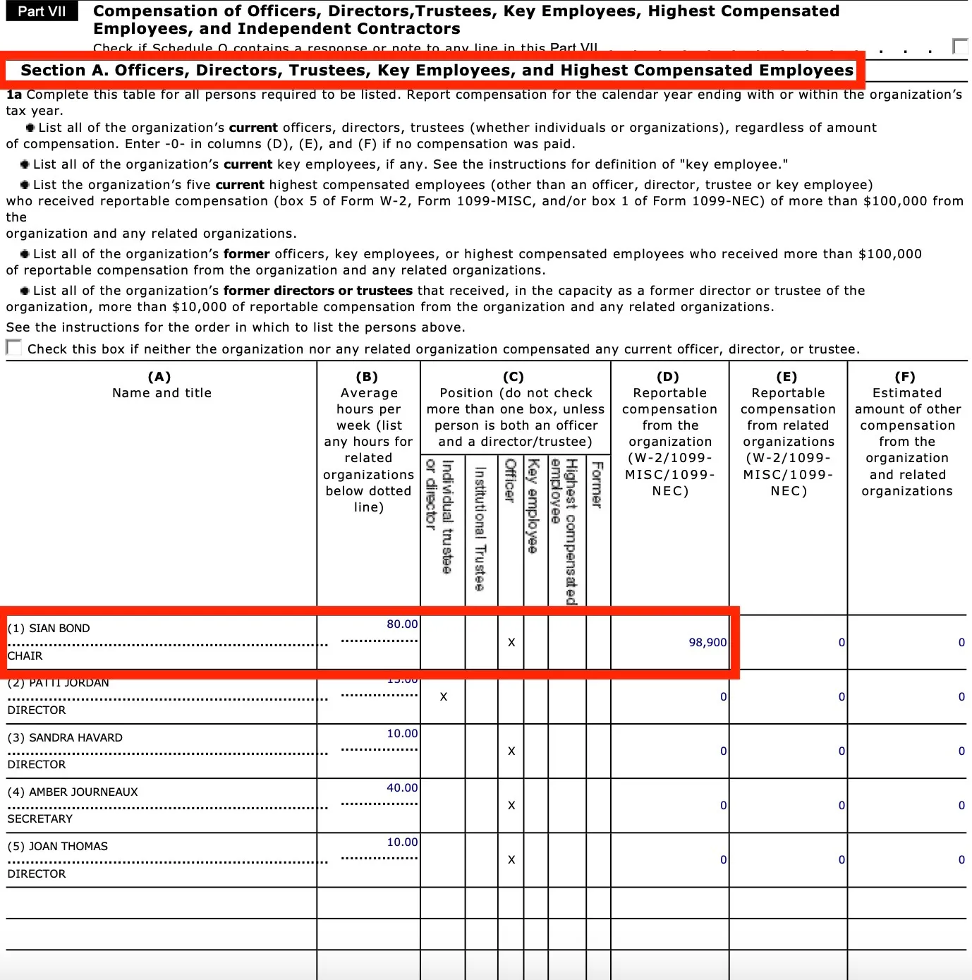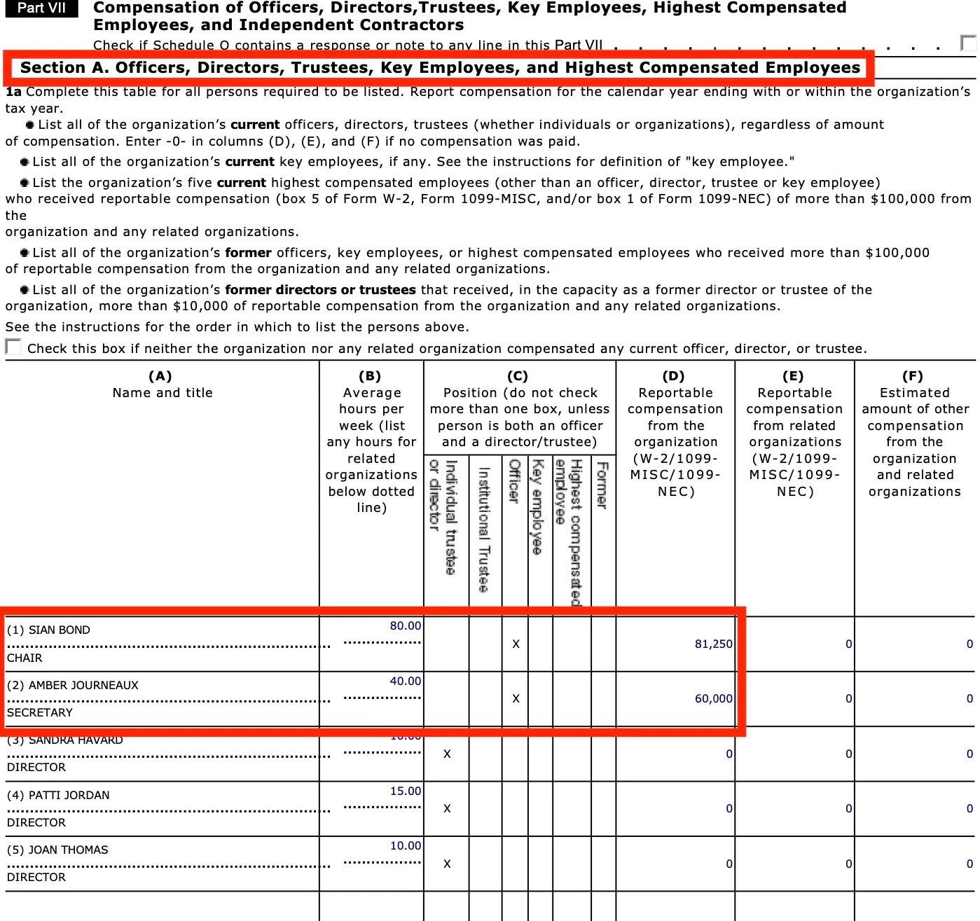 As you can see above, in 2021 Ginger Pet Rescue reported on its IRS Form 990 that it paid Ms. Bond $98,900. The IRS Form 990 below shows that in 2022 the rescue reported that it paid Ms. Bond $81,250 and a woman named Amber Journeaux $60,000. Ms. Journeaux is listed as Secretary of the board in 2021 although she didn’t get any compensation that year.